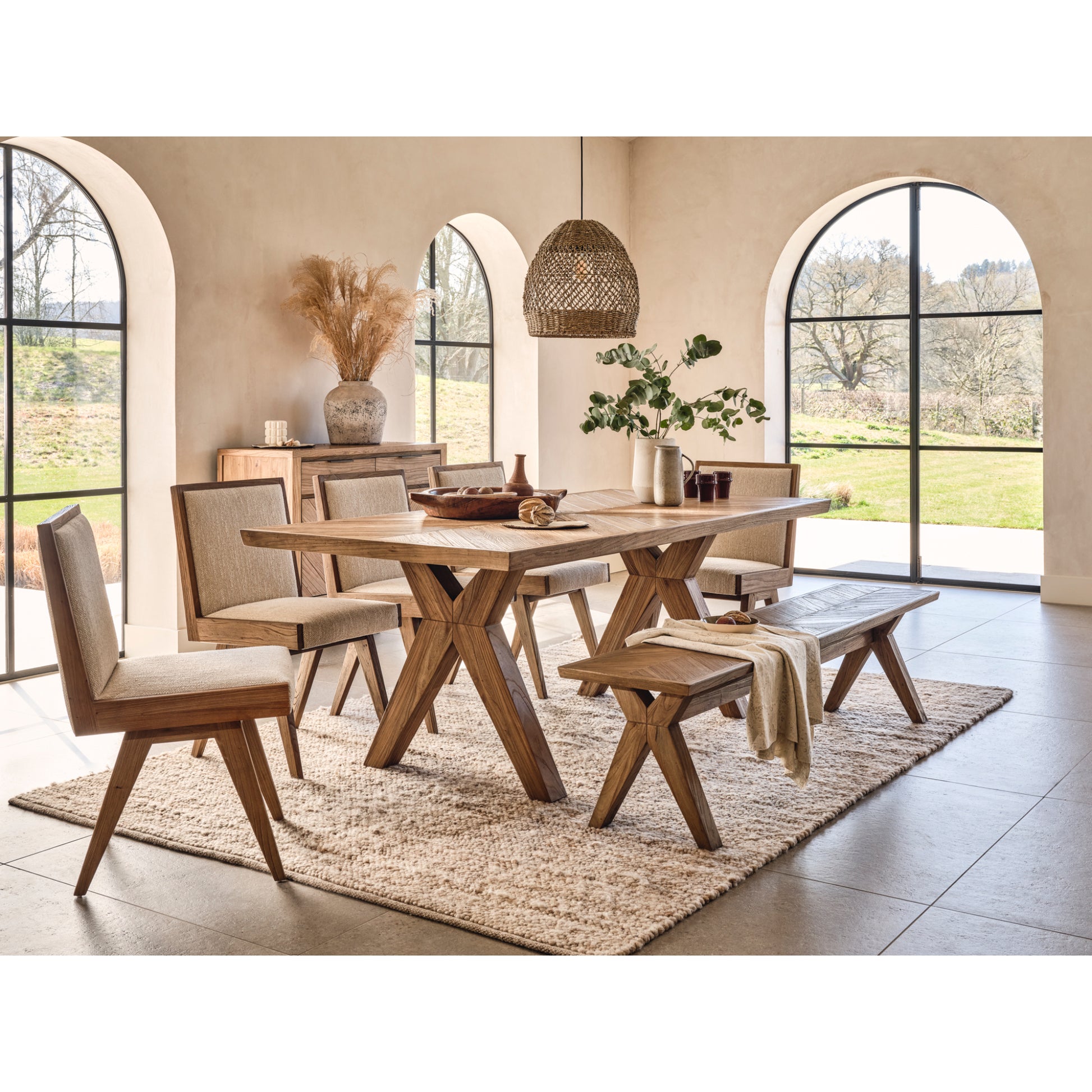 The striking 2-metre-long Sorrento dining table makes a unique design statement. A fabulous centre piece for family and friends to gather around. Pair this with matching chevron topped benches or the sumptuously upholstered Sorrento dining chairs.